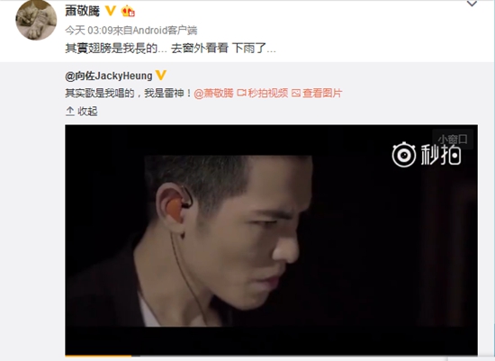 近日,《封神传奇》片方公布了电影主题曲MV《无痛的痛苦》。MV曝光后,有网友发现演唱者萧敬腾和电影主演向佐竟迷之撞脸,长相颇为相似,引发热议。 向佐更是发微博称:“歌是我唱的,我是雷神”,随后萧敬腾转发回复,称:“其实翅膀是我長的...去窗外看看,下雨了”。